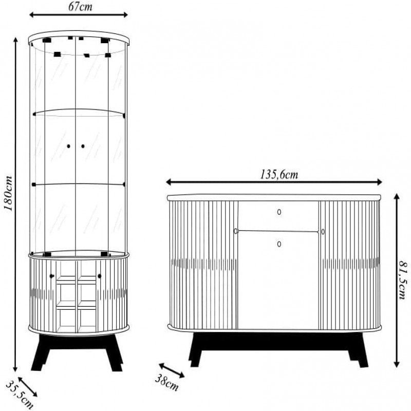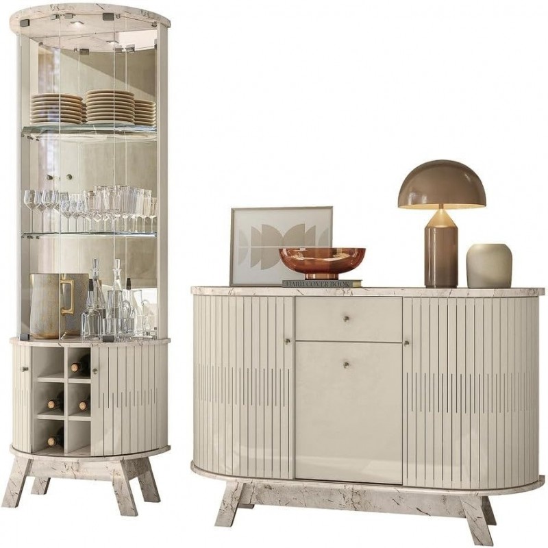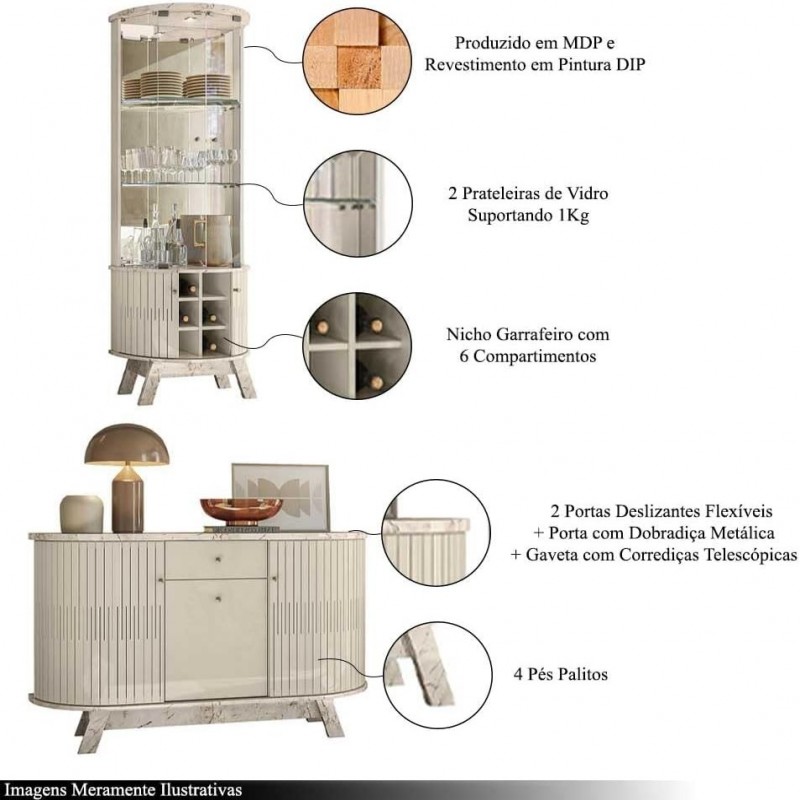 Conjunto composto por Buffet e Cristaleira dos modelos Robert Deker, fabricados em MDP com acabamento em pintura DIP. A estrutura do conjunto reúne compartimentos fechados, gavetas e nichos, integrando diferentes funções em uma única composição. A Cristaleira apresenta iluminação por LED e aplicação de espelho, com estrutura vertical composta por painÃ:copyright:is lisos e áreas específicas para exposição de objetos. Inclui nicho tipo garrafeiro, posicionado para acomodação de garrafas em disposição horizontal. O sistema de LED está embutido, voltado para destacar itens dispostos nas partes internas. O espelho Ã:copyright: aplicado em uma das superfícies, contribuindo para o efeito visual de profundidade. O Buffet possui estrutura com painÃ:copyright:is frontais fechados, gavetas inferiores e tampo superior plano, adequado para apoio. As superfícies externas seguem acabamento uniforme, com linhas retas e proporções simÃ:copyright:tricas em toda a composição. A base dos móveis Ã:copyright: apoiada diretamente no piso. O conjunto Ã:copyright: indicado para uso em ambientes internos, podendo ser posicionado em áreas sociais ou de recepção. A configuração dos elementos segue padrão fixo, sem volumes projetados ou elementos decorativos adicionais alÃ:copyright:m dos mencionados. A combinação entre os dois itens oferece compartimentos distintos e organizados, mantendo continuidade visual e integração funcional. Dimensões da Cristaleira: Altura: 180cm Largura: 67cm Profundidade: 35,5cm Dimensões do Buffet: Altura: 81,5cm Largura: 136cm Profundidade: 35,5cm Características do Produto: Material: MDP Revestimento: Pintura DIP Iluminação: Spot LED ( na Cristaleira ) Puxadores: Poliestireno cromado Gavetas: Sim, 2 Nicho: Garrafeiro com 6 compartimentos PÃ:copyright:s: Sim, 8 ( 4 PÃ:copyright:s em cada Produto ) Conteúdo da Embalagem: 1 Cristaleira, 1 Buffet Necessita de Montagem: Sim, sugerimos a contratação de um profissional. Instruções/Cuidado: Limpar com pano levemente umedecido com água ou detergente neutro. Observações Importantes: - As imagens são meramente ilustrativas e não acompanham objetos de decoração e eletros - Pode haver alguma diferença de tonalidade entre a imagem e o produto, por conta do tratamento de imagens e a calibração de cores da sua tela. - Todos os nossos produtos são enviados devidamente embalados e com total segurança - Confira as dimensões do produto no momento da compra e certifique-se de que passará normalmente por elevadores, portas, escadas e/ou corredores, evitando assim futuros desagrados ou imprevistos com a entrega do produto.