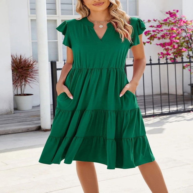 Características: mangas com babados, decote em V, silhueta rodada, bolsos, comprimento médio, design em camadas. Este vestido é perfeito para uso diário, praia, ar livre, rua, férias, festa.