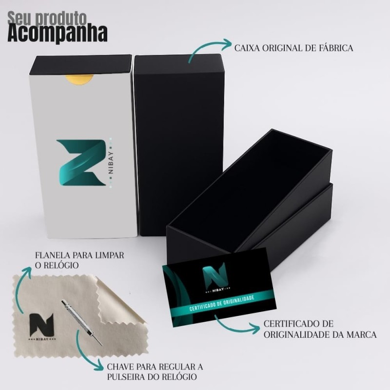 Apresentamos o Relógio Masculino Nibay Cronógrafo Funcional Analógico, um acessório que combina estilo e funcionalidade para o homem contemporâneo. Com um design elegante e minimalista, sua caixa em aço inoxidável nas cores prata e dourado reflete elegância em diversas ocasiões, seja no cotidiano ou em eventos sociais. Este modelo NB0923-2 possui um movimento a quartzo de alta precisão, com seis ponteiros que proporcionam uma excelente visualização do tempo. A tela analógica é protegida por cristal Hardlex, oferecendo resistência a impactos e um toque de sofisticação ao visual. A durabilidade é garantida com resistência à água de até 30 metros, tornando-o ideal para uso diário. O fecho dobrável assegura um ajuste perfeito no pulso, enquanto a retroiluminação e o calendário adicionam praticidade ao design. Seja para o trabalho ou o lazer, o Relógio Nibay é um complemento indispensável para aqueles que valorizam a união entre forma e função. Experimente a sensação de confiança e estilo que este relógio pode oferecer. Medidas: - Comprimento da pulseira: 25 cm - Espessura da caixa: 10 mm - Diâmetro do mostrador: 43 mm - Largura da pulseira: 22 mm Conteúdo da Embalagem: - Relógio - Estojo original do relógio - Certificado de originalidade - Nota Fiscal - Chave para ajustar a pulseira Resistente à Água: 30 Metros/3ATM - Respingos: Sim - Chuva: Sim - Lavar o Carro: Sim - Natação: Não - Mergulho: Não