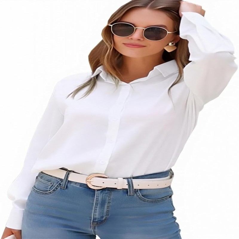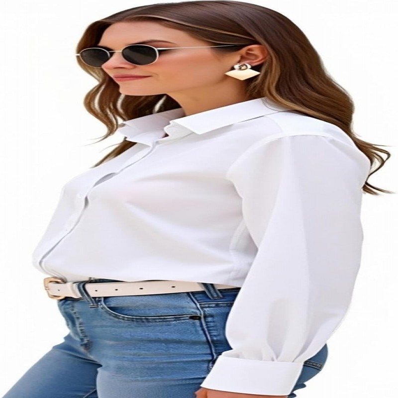 Características: Feito de tecido chiffon de poliéster texturizado, material de alta qualidade, super macio, leve e respirável, super confortável ao toque e ao usar, não amassa e deforma facilmente. Possui gola virada para baixo, manga comprida, botão para baixo, ajuste solto, não apertado ou transparente, com uma bainha arredondada para cobrir os quadris. Você pode enrolar ou abaixar as mangas de acordo com seus gostos