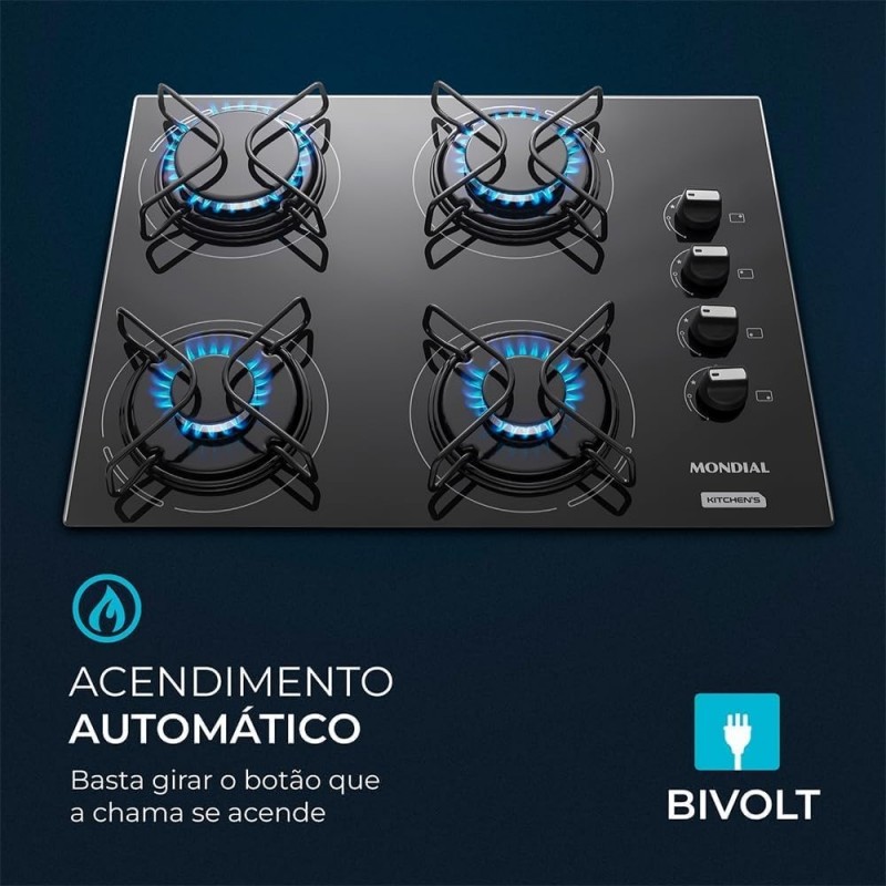 ACENDIMENTO AUTOMÁTICO: Agilidade e segurança para o dia a dia. Basta girar o botão que a chama acende.