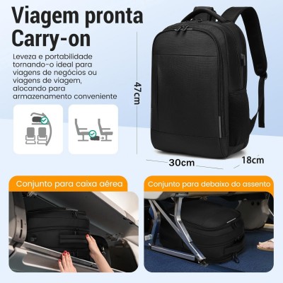 1.Compartimento separado para laptop se encaixa em 17/15/14/13 polegadas Macbook / Laptop.Main compartimento espaçoso para acessórios eletrônicos de tecnologia, roupas de 3-5 dias, A4 Books.Compartimento frontal com 2 bolsos para banco de potência e barbeador, 2 bolsos para caneta e gancho de chaveiro. Bolso para meias e luvas. Bolso frontal oculto com zíper acomoda papéis.2 bolsos de malha para garrafa de água e guarda-chuva compacto.