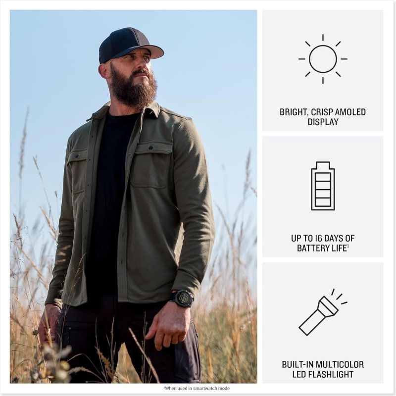 O smartwatch GPS tático avançado possui uma tela AMOLED brilhante de 1,4 polegadas, bisel de titânio e lente de safira, interface gráfica aprimorada e lanterna LED embutida para visibilidade após o anoitecer
