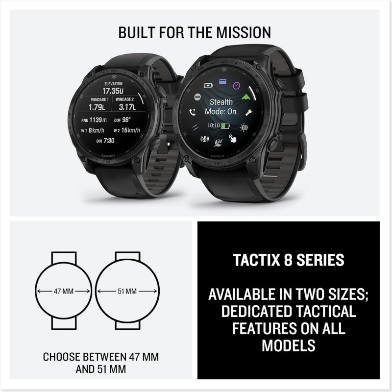 Suba acima com o tactix® 8. É o melhor smartwatch tático, com uma impressionante tela AMOLED, bisel de titânio, lente de safira e uma classificação de mergulho de 40 metros. Combine com o seu smartphone para chamadas no pulso com o alto-falante e microfone embutidos. Recursos táticos dedicados incluem uma atividade de rucking e solucionador Applied Ballistics® pré-carregado, juntamente com uma atividade jumpmaster, projeção de waypoint, modo furtivo, interruptor de eliminação e muito mais. Guie a missão com uma lanterna LED embutida. Treine como nunca antes com planos de treinamento de força, exercícios específicos para esportes e exercícios de força sugeridos diários para corredores e ciclistas. Navegue ao ar livre com precisão de posicionamento superior, graças ao GPS multibanda com tecnologia SatIQ™ mais sensores integrados para bússola de 3 eixos, giroscópio e altímetro barométrico. Empurre com mais força com até 16 dias de vida útil da bateria no modo smartwatch.