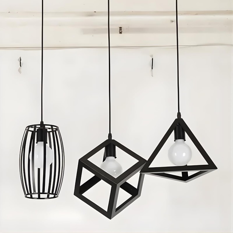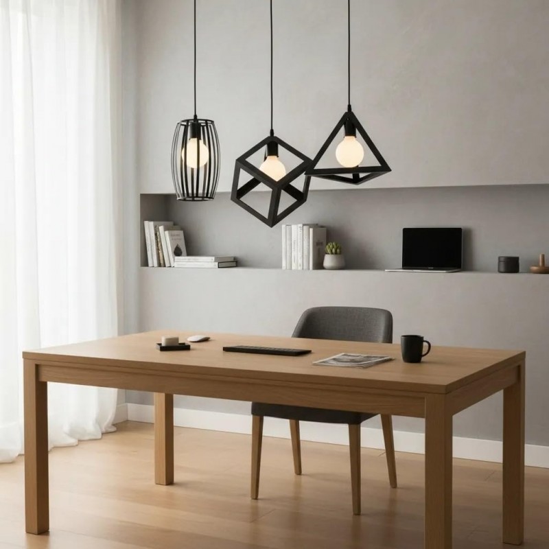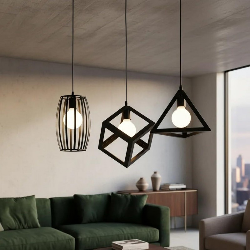 Com estrutura em aço preto e suporte para três lâmpadas E27, ele proporciona uma iluminação ampla e equilibrada, permitindo personalizar o efeito luminoso de acordo com o tipo de lâmpada escolhida. Seu design geométrico adiciona personalidade e sofisticação ao ambiente.